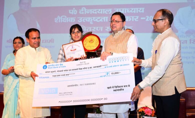 मुख्यमंत्री पुष्कर सिंह धामी ने गुरुवार को नानूरखेड़ा स्थित एससीईआरटी ऑडिटोरियम में आयोजित पंडित दीनदयाल उपाध्याय शैक्षिक उत्कृष्टता पुरस्कार समारोह में बोर्ड परीक्षाओं में शीर्ष 10 स्थान प्राप्त करने वाले हाईस्कूल एवं इंटरमीडिएट के 75 मेधावी छात्र-छात्राओं को पुरस्कृत किया। इस मौके पर बोर्ड परीक्षाओं में उत्कृष्ट परिणाम देने वाले विद्यालयों के तीन-तीन प्रधानाचार्यों के साथ ही श्रेष्ठ प्रदर्शन करने वाले शीर्ष 50-50 विद्यालयों के प्रधानाचार्यों को भी सम्मानित किया।