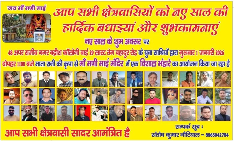 जय माता दी देहरादून मां मणी माई मंदिर में 1 जनवरी 2026 को वार्ड 48 बद्रीश कॉलोनी तथा वार्ड 29 लास्ट तेग बहादुर रोड के युवा साथियों द्वारा एक विशाल भंडारे का आयोजन किया जा रहा है ।