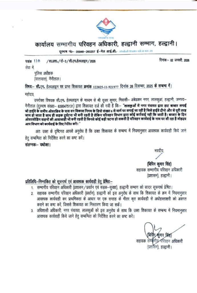 शिकायत के संज्ञान में आते ही सहायक संभागीय परिवहन अधिकारी (प्रशासन) बिपिन कुमार सिंह ने पुलिस अधीक्षक (यातायात), नैनीताल को पत्र भेजकर नियमानुसार आवश्यक कार्रवाई के निर्देश देने का अनुरोध किया है। साथ ही परिवहन विभाग के प्रवर्तन अधिकारियों और नगर पंचायत लालकुआं को भी पत्र भेजकर मामले में शीघ्र कार्रवाई करने को कहा गया है।