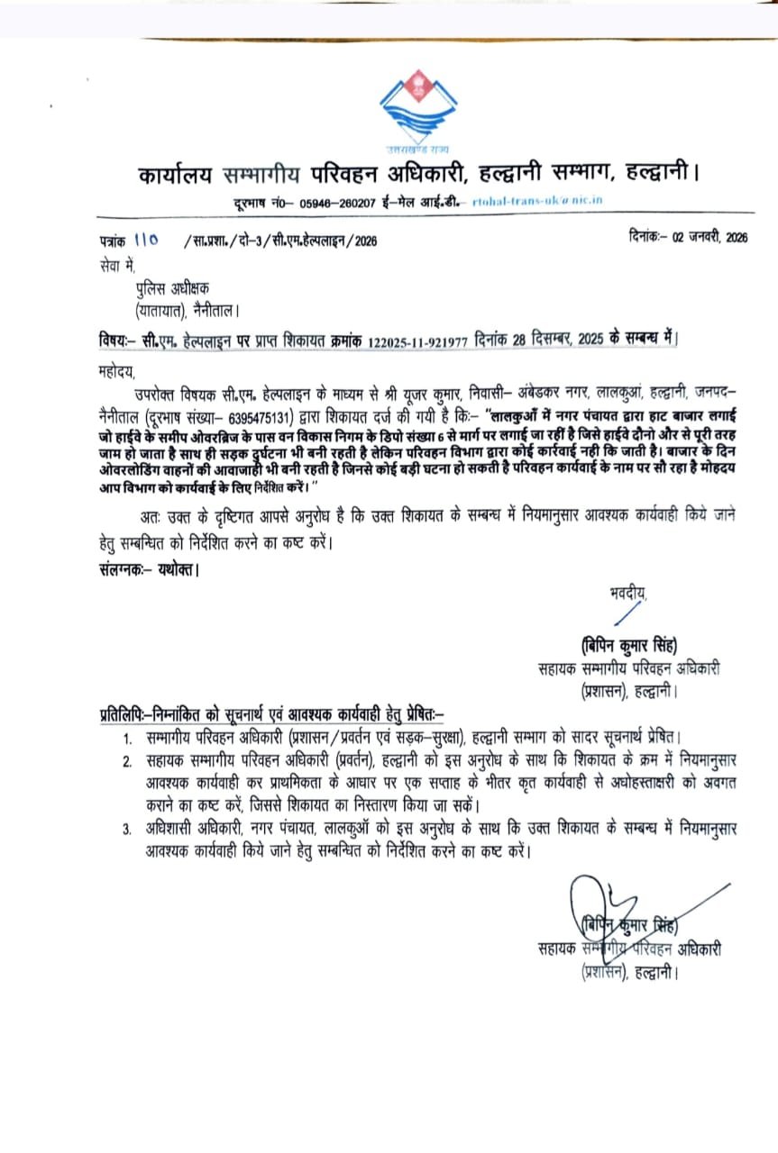 बताते चले कि यहाँ अबेडकर नगर, लालकुआं निवासी मुकेश कुमार ने 28 दिसंबर 2025 को सीएम हेल्पलाइन पर शिकायत दर्ज कर आरोप लगाया कि बाजार के दिन हाईवे पूरी तरह अवरुद्ध हो जाता है। साथ ही ओवरलोड वाहनों की आवाजाही लगातार बनी रहती है, जिससे किसी बड़ी दुर्घटना की आशंका बनी हुई है। शिकायतकर्ता का आरोप है कि परिवहन विभाग द्वारा इस पर कोई प्रभावी कार्रवाई नहीं की जा रही है।