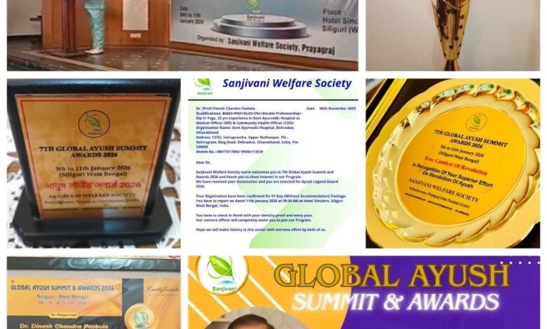 देहरादून: 25 जनवरी 2026, रविवार। संजीवनी हैल्थ केयर सोसाइटी, प्रयागराज, उत्तर प्रदेश द्वारा होटल Sinclaires, सिलीगुड़ी, पं० बंगाल में तीन‌ दिवसीय Global AYUSH Summit & Awards 2026 कार्यक्रम का आयोजन किया गया। जिसमें आयुष मेडिसिन एवं हैल्थ अवेयरनेस के क्षेत्र में उत्कृष्ट कार्य करने वाले देश-विदेश के विख्यात आयुष चिकित्सकों को सम्मानित किया गया।