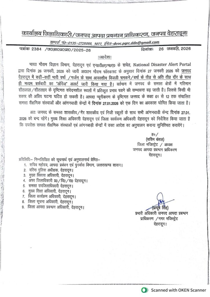 अतः जनपद के समस्त शासकीय / गैर शासकीय एवं निजी स्कूलों के साथ सभी आंगनबाडी केन्द्र 27.01. 2026 को बन्द रहेंगे। मुख्य शिक्षा अधिकारी देहरादून एवं जिला कार्यकम अधिकारी देहरादून को निर्देशित किया जाता है कि उपरोक्त समस्त शैक्षणिक संस्थाओं एवं आंगनबाड़ी केन्द्रों में उक्त आदेश का अनुपालन कराना सुनिश्चित करायेंगे।