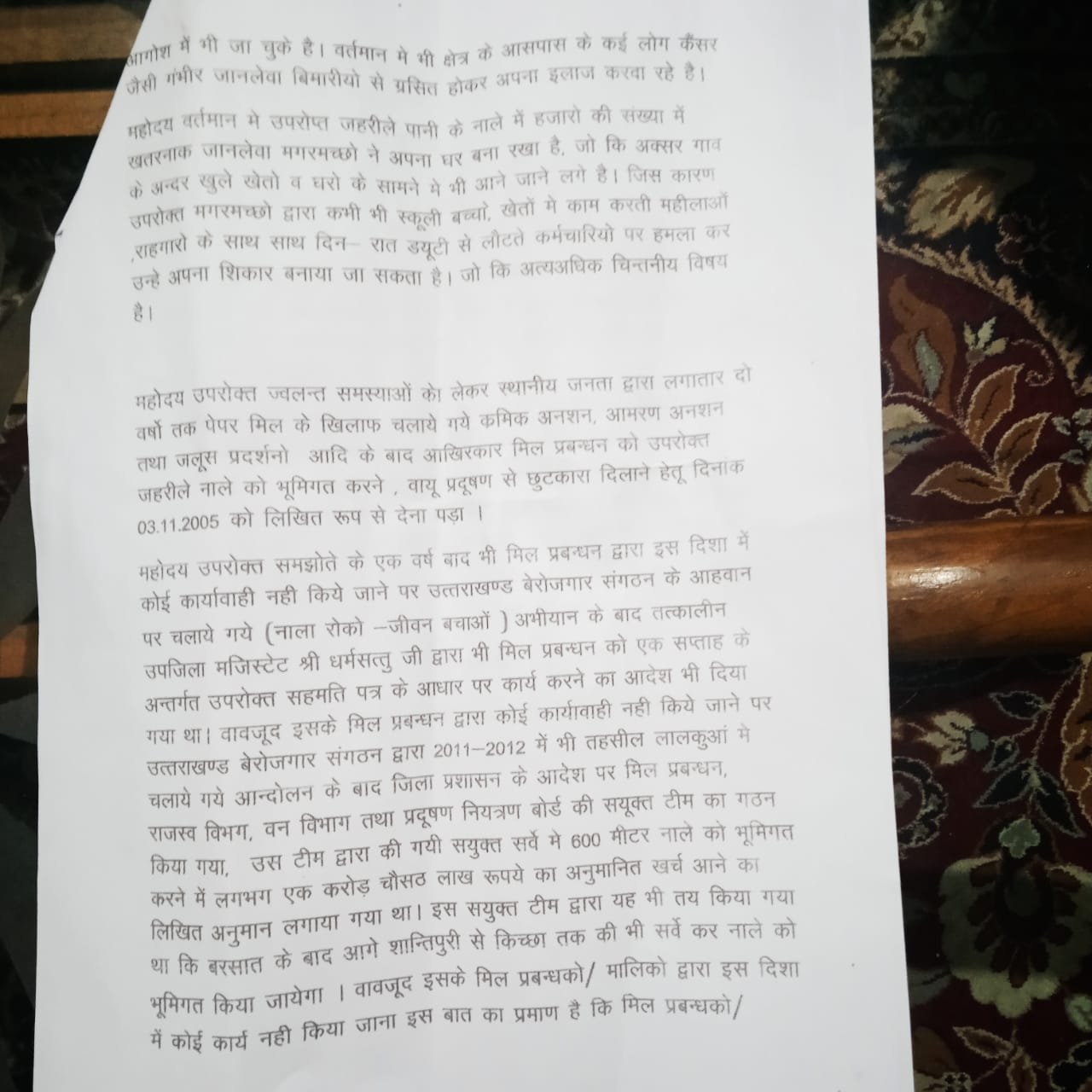 वही दिये गए ज्ञापन में वर्ष 2006 में जिला प्रशासन द्वारा सेंचुरी पेपर मिल प्रबंधन को दिए गए आदेशों का पालन करवाने, जहरीले नाले को भूमिगत करने तथा उसमें पल रहे विशालकाय मगरमच्छों के आतंक से क्षेत्रवासियों को सुरक्षा दिलाने की मांग की गई है। साथ ही प्रदूषण से प्रभावित स्थानीय युवाओं को रोजगार में प्राथमिकता देने की भी मांग उठाई गई।